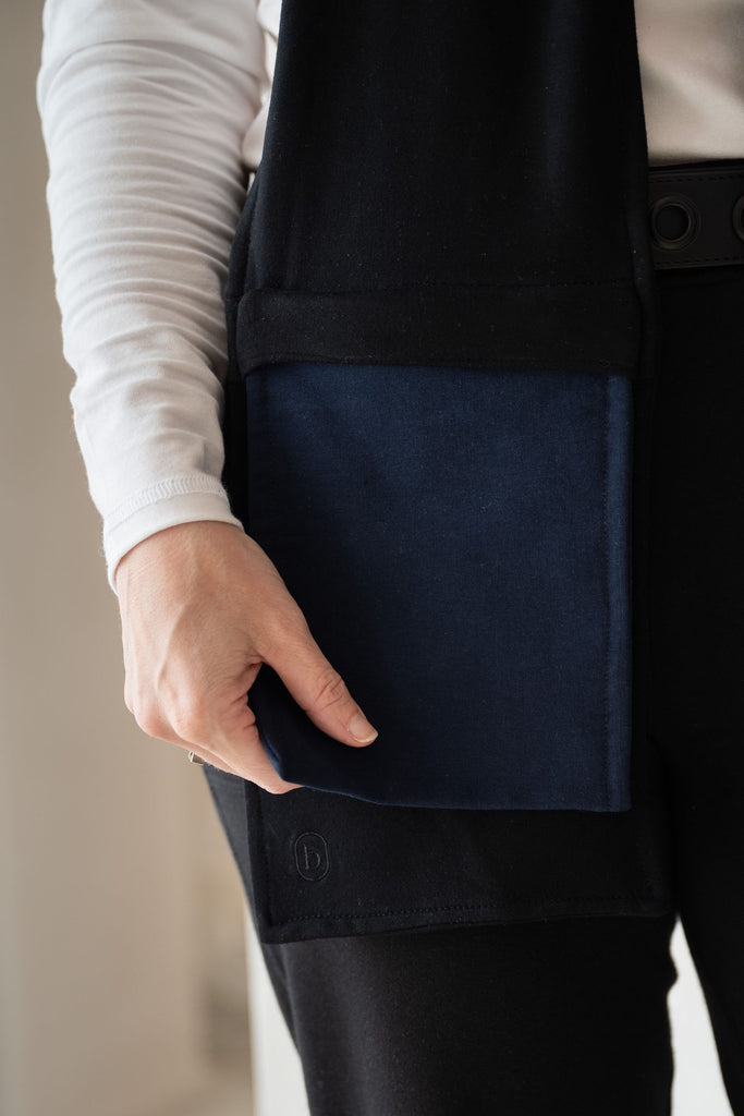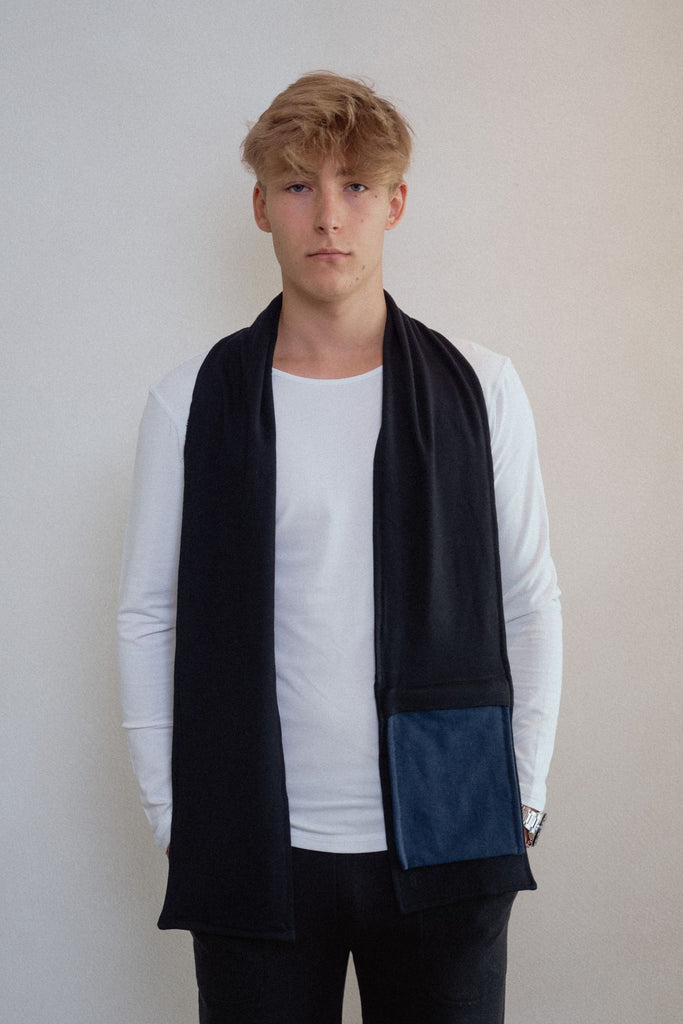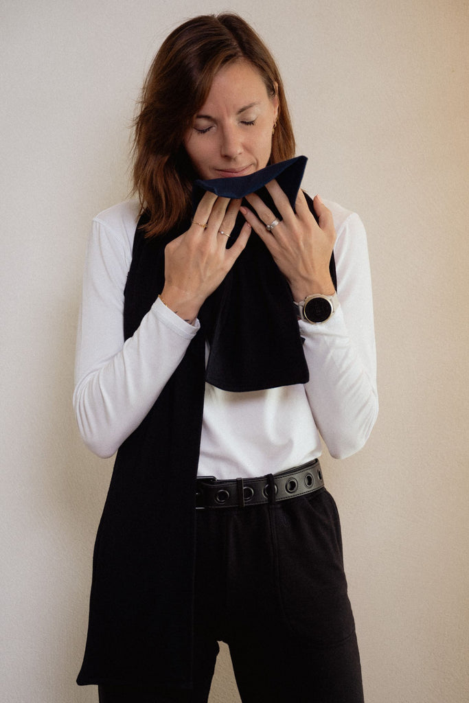 Écharpe noire fabriquée à partir d’un mélange premium de 94 % viscose de bambou et 6 % élasthanne. Panneau bleu amovible composé de 97 % coton et 3 % élasthanne, infusé aux huiles essentielles naturelles de lavande. Retirer le panneau parfumé avant lavage. Laver délicatement à 30°C, ne pas utiliser d’eau de Javel, sécher à plat et repasser à basse température.