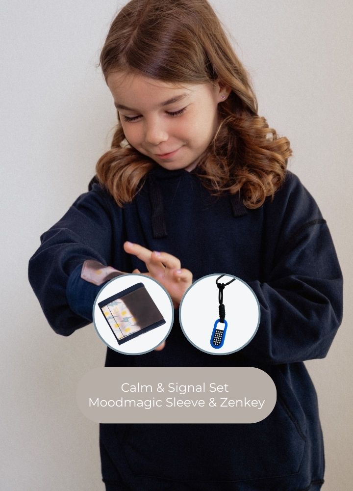 A smart duo to help kids feel calm and understood. The MoodMagic Sleeve changes color with warmth, offering a fun, wordless way to express emotions. Paired with the Zenkey — a soft, chewable fidget for moments of stress or restlessness — this set offers stylish support for self-expression and self-regulation, always within reach.