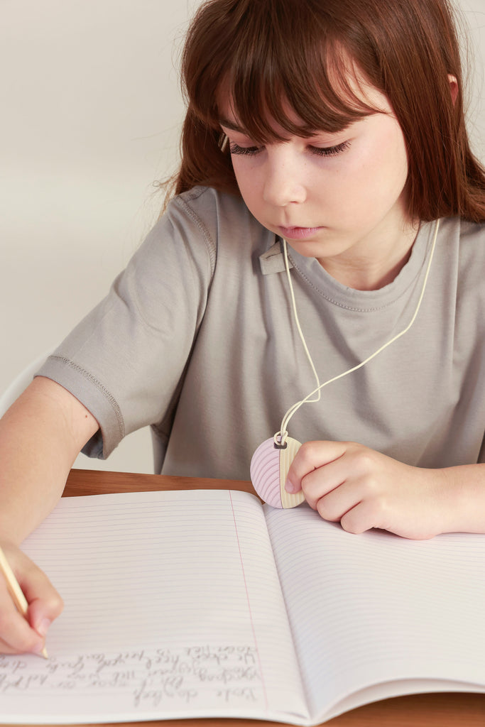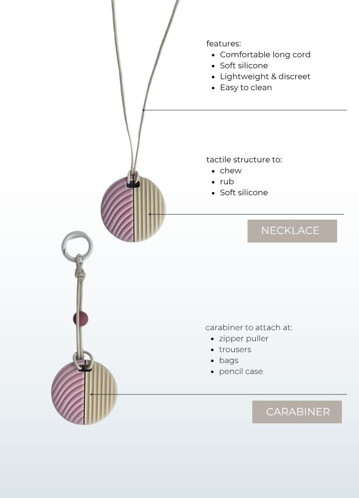 Designed for self-regulation and focus, the CalmCircle is a soft, 100% safe silicone fidget you can chew or rub. Its round shape features a dotted front and ribbed back for calming tactile input. Easy to hang on a zipper, bag, or pencil case — or wear it as a necklace. Always within reach for moments of stress.
