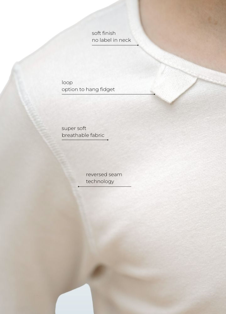 Ideal for those with heightened sensitivities, it also combines the element of functionality by incorporating a loop at the neckline and hem that allows you to attach a chewy fidget, allowing for focus and relaxation throughout the day.